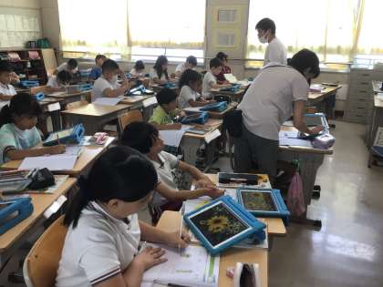 という訳で、学習用タブレットでひまわりの花の写真を見ています。