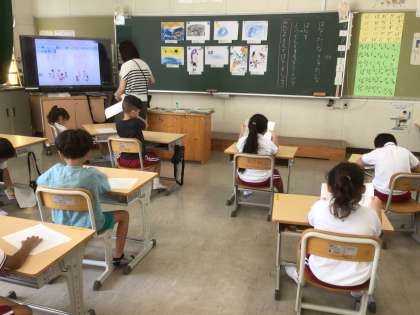 9月8日 国語 国際1年生 公開日 2025/09/08 更新日 2025/09/08 校長室から はなしたいな ききたいな 夏休みのできごとを絵を見せながら話します。 みんないろいろなところへ連れて行ってもらえたのね。