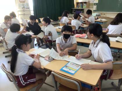 9月9日 国語 5年生 公開日 2025/09/09 更新日 2025/09/09 校長室から 三人よれば文殊の知恵 少人数での話し合いの場面 👦「えー全然書いてない」 👧「わたしも」 🧒「3人ヨレバモンジュノチエ」