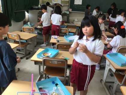おもちゃ作り 1年生と遊ぶおもちゃを作っています。
