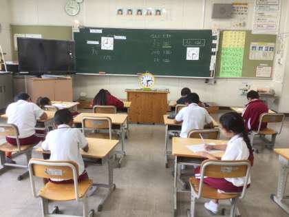 あれ?静かに全員座っている・・・。 今日の課題が終わり、ごほうびのお絵描きタイムでした。
