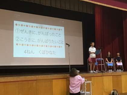 10月10日 前期終業式 その1 公開日 2025/10/10 更新日 2025/10/10 校長室から 前期が終わります。 体育館で終業式を行いました。 はじめに3年生と4年生による意見発表がありました。 あきらめずにがんばったこと、外国語活動ではずかしかったけれど練習に取り組みできるようになったことなど、堂々と発表できました。