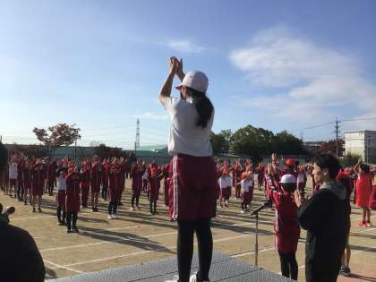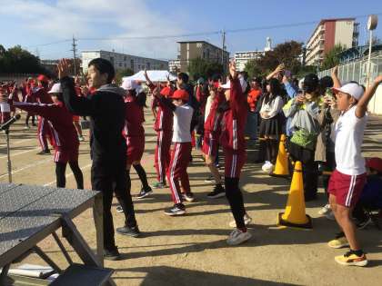 今年の準備運動は、ひがしホミーゴです。 みんな笑顔で踊ることができました。