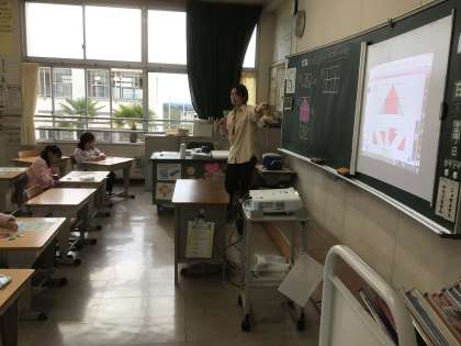 色いたをならべてかたちを作ろう 三角形の色板を組み合わせて、形づくりに挑戦しました。