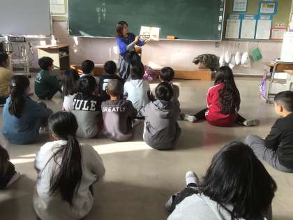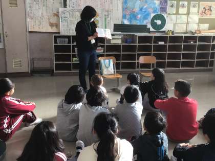 今日は11月の読み語りの日。 さあ、どんなお話を読んでもらえるかな? 4年生の様子です。