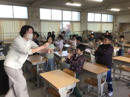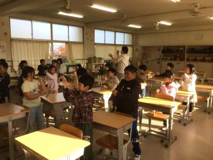 11月19日 音楽 1年生 公開日 2025/11/19 更新日 2025/11/19 校長室から いろいろな音を見つけてならそう 今日は音楽室で授業をしました。 トライアングル、ウッドブロック、鈴を使って音を鳴らしました。 鈴を鳴らすとき、「ジングルベル」をピアノで弾いてもらえたので、みんなノリノリで鈴を鳴らしました。