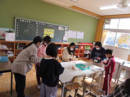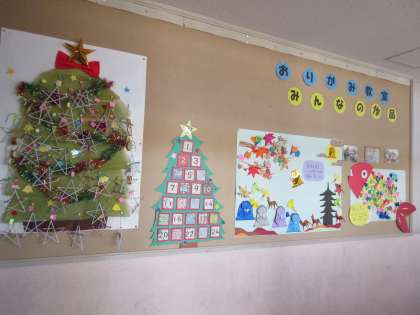 ひまわりタイムの折り紙教室では、子どもたちがストローを使った星のオーナメントを作るサポートをしていただきました。素敵な掲示物が完成しました。いつもありがとうございます。