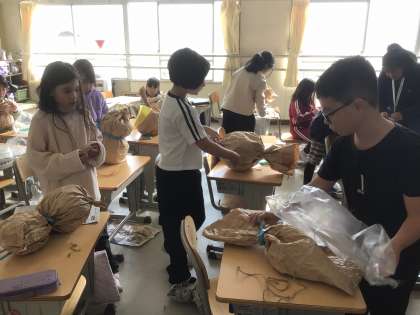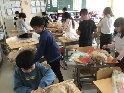 紙の感触を楽しみながら、くしゃくしゃにしてから伸ばし、何か形を作っていきました。