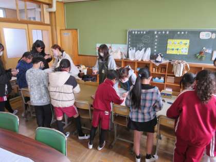 お忙しい中、今日は6名の方に環境ボランティアに来ていただきました。3年生と6年生の昇降口付近の落ち葉掃き、家庭科室の椅子カバー作り、折り紙教室のサポートをしていただきました。