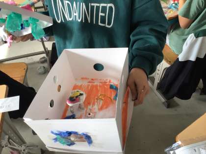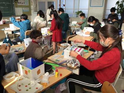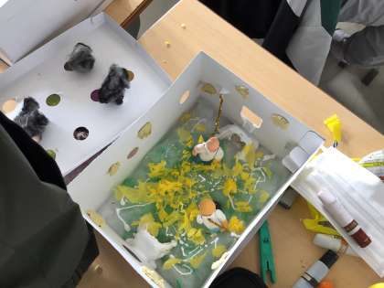 12月17日 図工 5年生 公開日 2025/12/17 更新日 2025/12/17 校長室から のぞいてみると 箱の中にはこんな世界が広がっている・・・・。 紙粘土や色セロファンを使って、楽しい世界をつくりました。