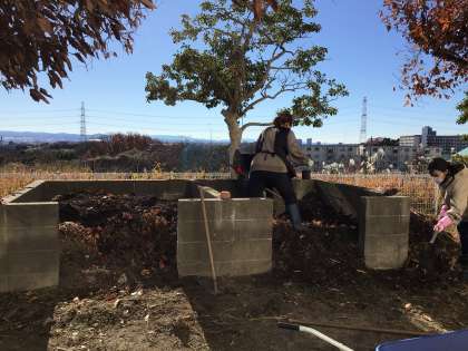 そこへ集めた落ち葉を入れて、土をかぶせました。