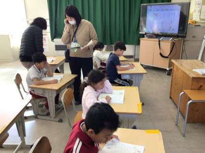 12月18日 国語 国際1年生 公開日 2025/12/18 更新日 2025/12/18 校長室から おとうとねずみチロ 3つの会話文を示して 「いちばん大きな声で読むのはどれかな?」 手がさっとあがります。 落ち着いて学習していました。