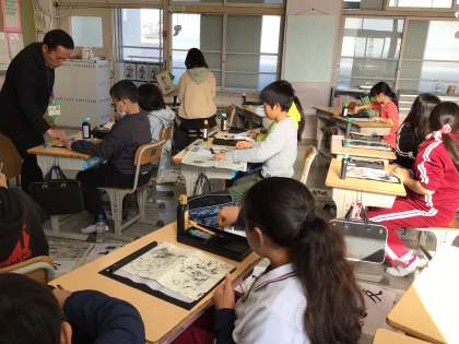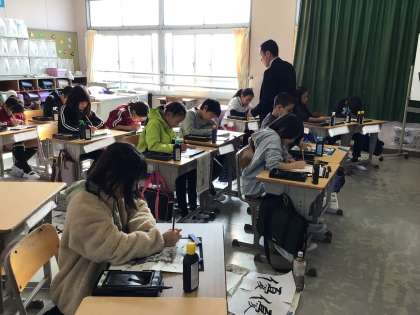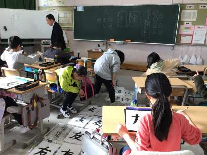 今年の目標を漢字一字で書こう お手本がないと難しいね。 でも、のびのびと書いている様子が見られました。