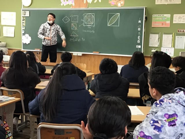 6年生は図形の面積の求め方を先生がていねいに解説していました。