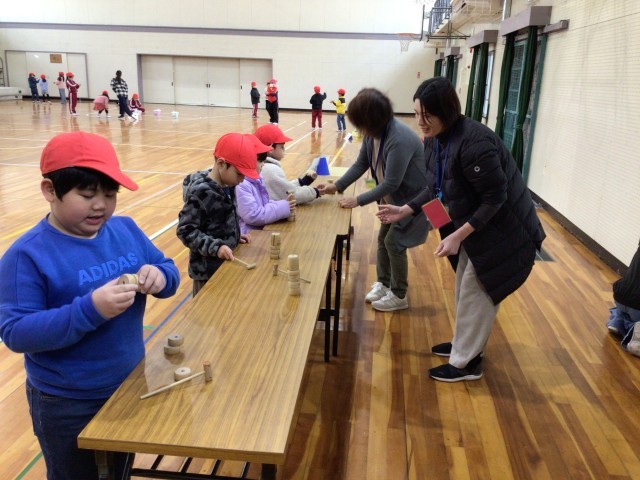 だるま落とし、ヨーヨー、けん玉、お手玉、こままわし 5つのグループに分かれて楽しみました。
