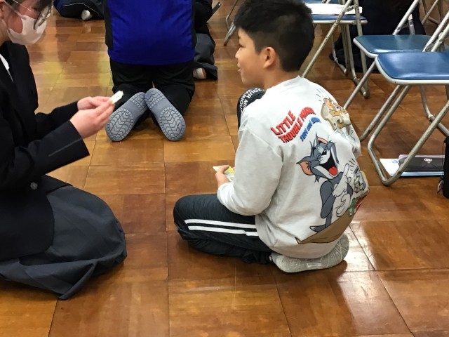 2月3日 保見中交流会 8くみ 公開日 2026/02/03 更新日 2026/02/03 校長室から 8くみの2人がこの春入学する保見中学校の交流会に参加しました。楽しいオープニングが始まりました。ゲームでは、自分のカードを持って自己紹介しました。中学校への不安が少し減りました。