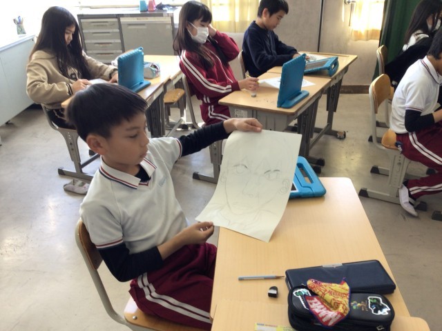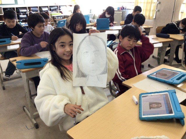 2月9日 図工 4年生 公開日 2026/02/09 更新日 2026/02/09 校長室から 自分の顔をかこう学習用タブレットで撮影した自分の顔を見ながら描きました。「似てるじゃん」「まさにあなた!」