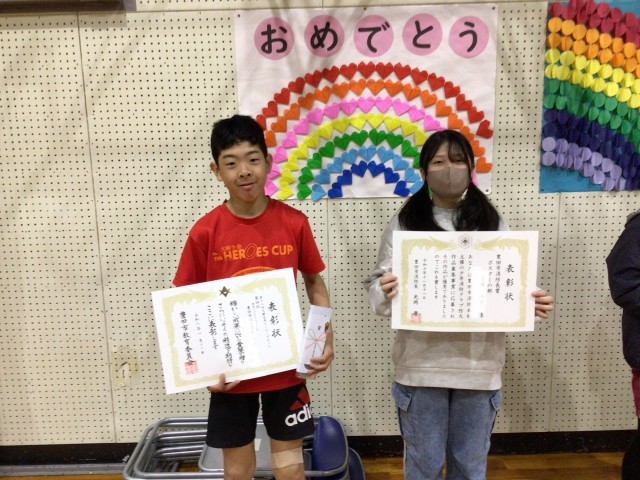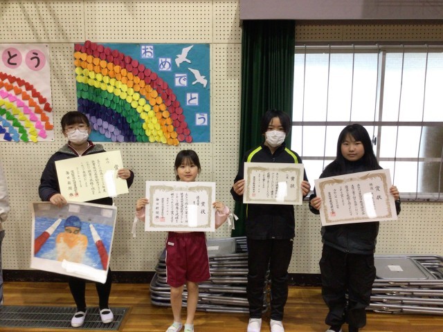 はじめに表彰伝達を行いました。書き初めコンクールや読書感想画、読書感想文などの表彰伝達をしました。
