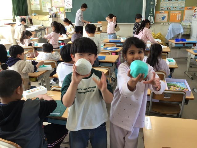 教室に入っていくと、「これ作った」「写真撮って」と見せてくれました。