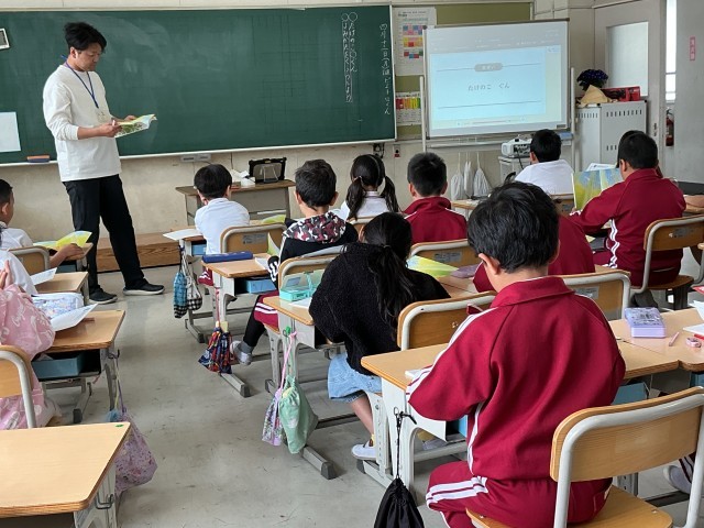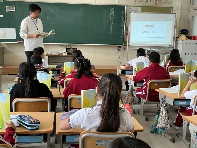 国語の教科書を開いて、「たけのこぐん」を力強く音読しました。