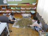 5年生バケツ稲の稲刈り後のワラをもらい、きれいなところを選別し、干すために束ねて...