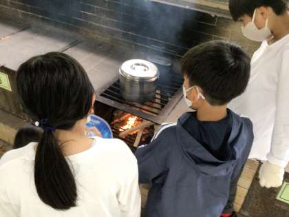 「絶対に起こして見せる」と意気込んで取り組んだ火起こし。30分間でほとんどの班が成功し、カレーやご飯作りにつながりました。なかには意地になって45分以上も粘り、見事に火起こしに成功して満面の笑みを浮かべた班もありました。もう少しで夕食ができそうです。