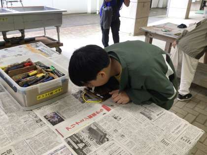 予定を変更して、午前中にクラフト作りを行っています。バーナーで焼いた後に磨き、ヒートンをつけて写真入れを作っています。仕上げにポスカで、思い思いに絵や文字を書き、世界でひとつだけの作品が完成する予定です。どんな作品に仕上がったか、お楽しみに。