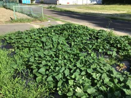 1年生が植えたサツマイモ畑の様子です。 だいぶ葉が生い茂っています。