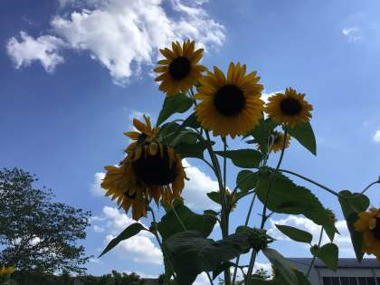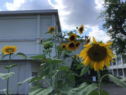 正門のそばには「ひまわり」がたくさん咲いています。