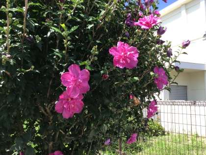 正門の近くに花がきれいに咲いています。
