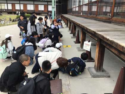 本日最初の見学地「二条城」を観てきました。城の広さ、豪華さに驚くと共に、大政奉還という歴史的事実を身近に感じることができました。
