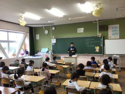 1年生が、朝の会で先生の話を聞いています。 みなさん、しっかり話を聞けていますね。