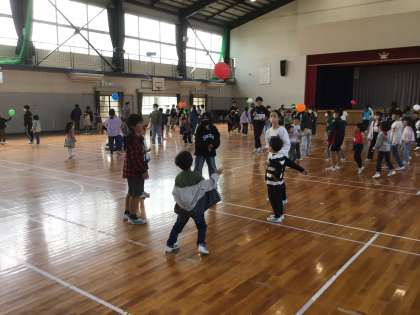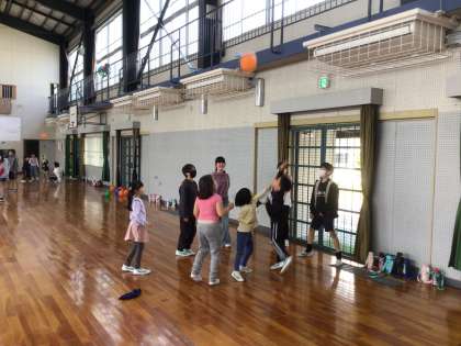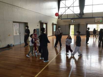 自己紹介をした後、グループで協力して風船を落とさないようにするゲームをしました。