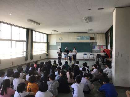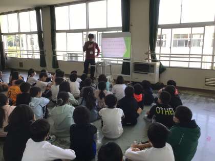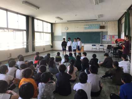 5年生が、6月に実施される野外学習(キャンプ)に向けて学年集会をしています。
