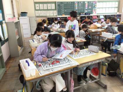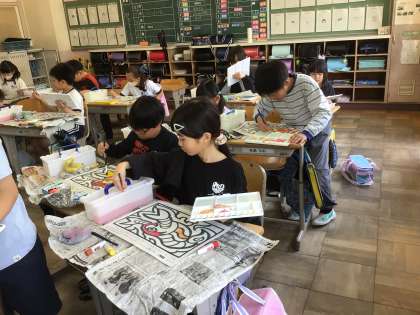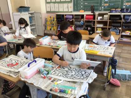 3年生が、赤と黄色の2色を混ぜて色づかいの勉強をしています。