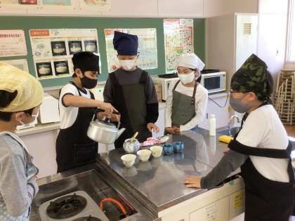 お湯を沸騰させた後、急須に入れています。