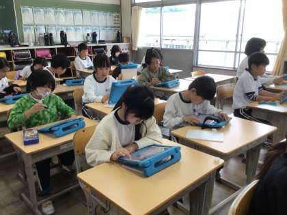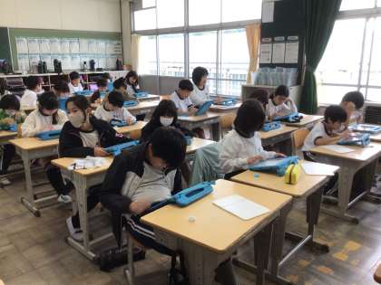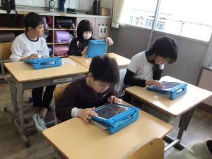 4年生が、学習用タブレットにあるアプリ(キュビナ)を使って、ドリル学習をしています。