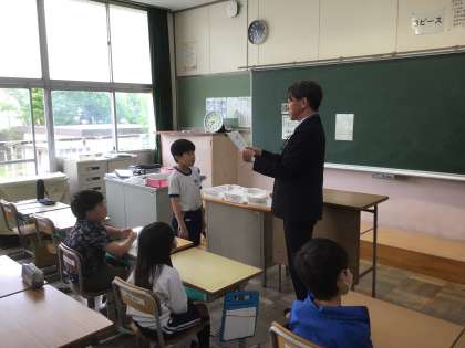 朝の会で、東山賞を校長先生から受け取っています。