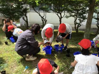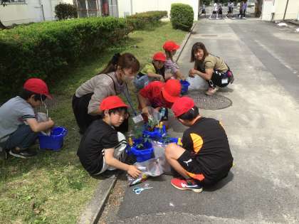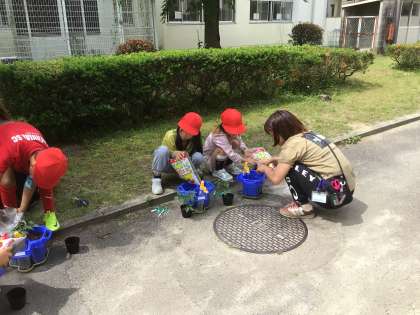 2年生が、ミニトマトの苗を植えています。ボランティアさんに協力してもらっています。
