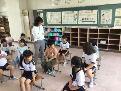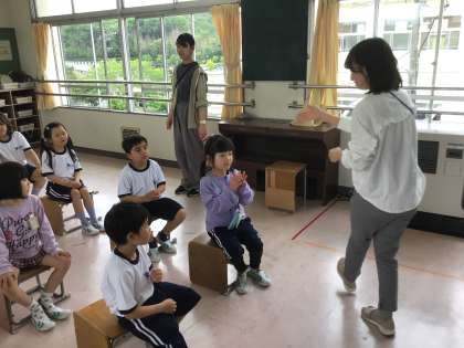 1年生が、リズムに合わせて手拍子をしています。 1人ずつ練習をしています。