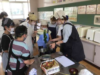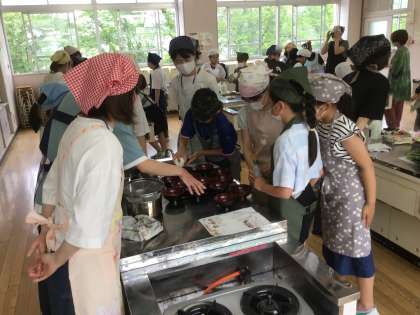 5年生が、ゆでいもとほうれんそうのお浸しを作っています。