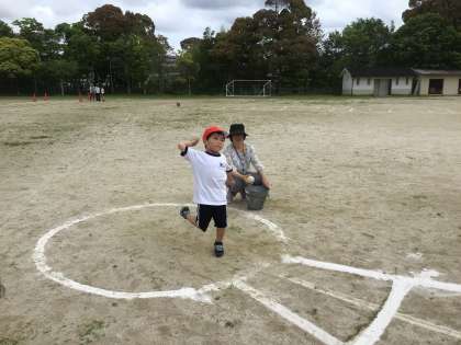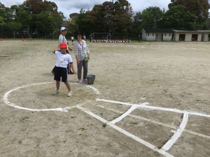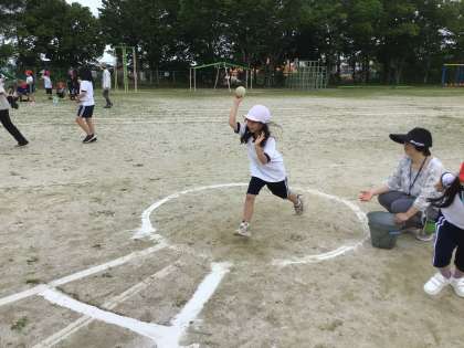 体力テストの様子です。 1年生が、ソフトボール投げをしています。