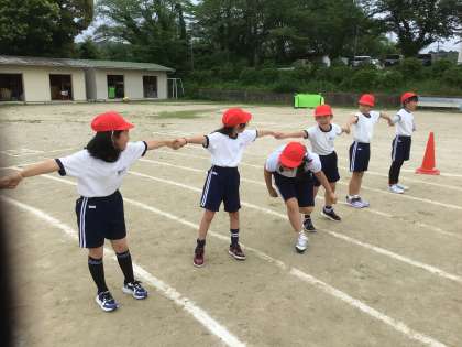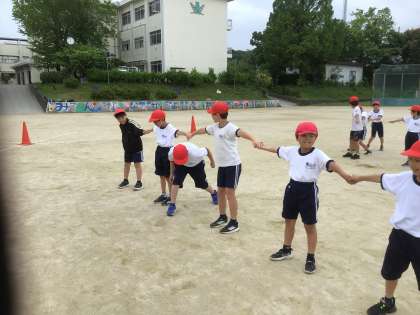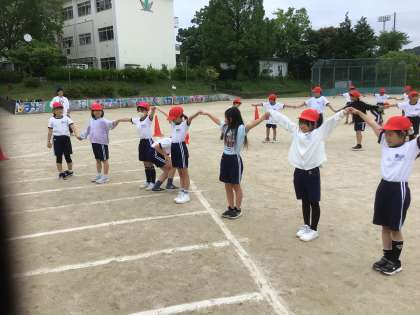 4年生が、手をつないだ人の間をくぐる運動をしています。