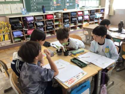 3年生が、ホウセンカとヒマワリの違いについて話し合っています。
