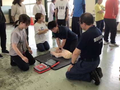 教職員が、明日から始まる水泳学習を前に、中消防署の方々を講師として心肺蘇生訓練を行いました。