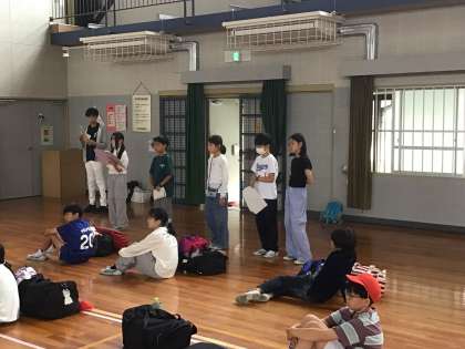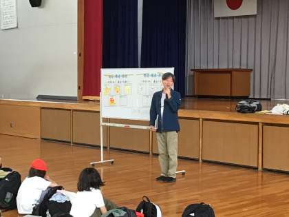 5年生が、野外学習の出発式をしています。 とてもいい天気になりそうです。