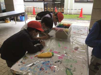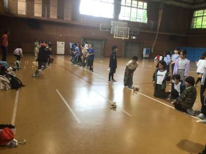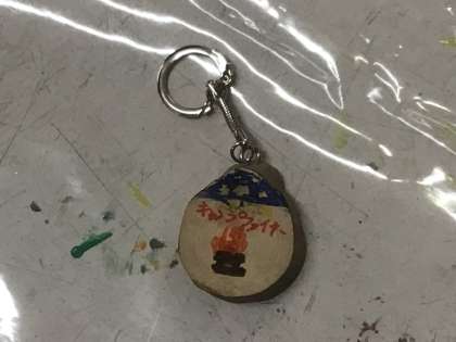 野外学習2日目の午前中は雨のため、体育館で「班対抗ちびっ子ギネス」を行い、に盛り上がりました。午後からは、キャンプの思い出づくりとして、木のキーホルダーをつくりました。