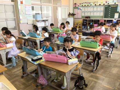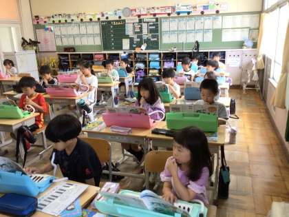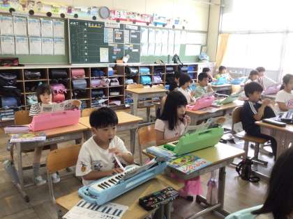 2年生が、鍵盤ハーモニカで演奏しています。色々な曲をずらして演奏して楽しみました。