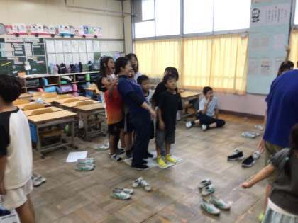 1年生から6年生までの縦割り班ごとに分かれて、ゲームをしています。