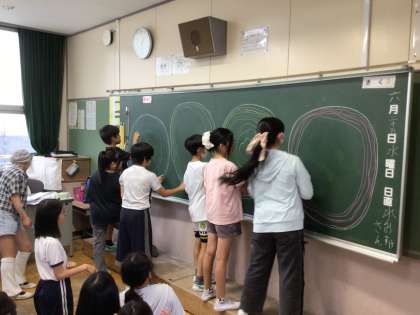 絵かきしりとりや新聞紙に何人乗れるか競争をしたり、黒板にたくさん丸をかいたりして遊びました。